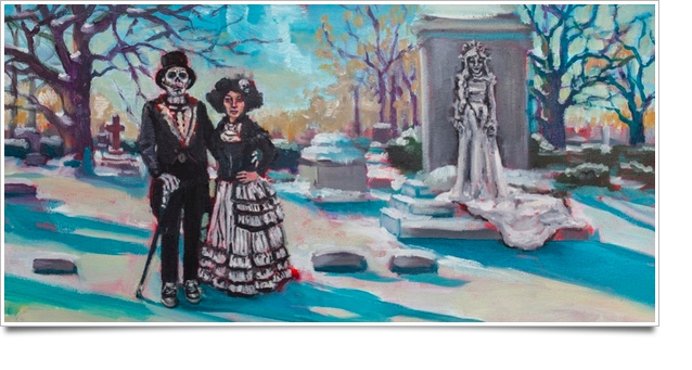 The first artist reception took place at Lakewood’s Good Goat Gallery. “I enjoy painting humor more than anything,” says Good Goat’s owner A. Nancy Cintron. “My artwork is meant to induce a smile. Although, this new series, Death Shall Not Part Us, is a little more serious, but still conveys happiness… it’s a happy ending, with a new beginning”.