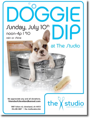 Pamper your pooch while helping other animals in need on Sun 7/10. Bring your dog to Doggie Dip @ The Studio to be brushed and scrubbed with Paul Mitchell brand dog shampoo (shampoo compliments of The Studio). Just $10/dog and all proceeds benefit Friends of the Cleveland Kennel.
