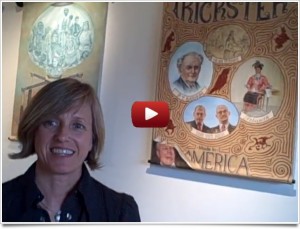 To reacquaint us with this malady, Pebworth is crossing the country, west to east, with her traveling exhibition entitled, “America: Beautiful Possibility”. This exhibit incorporates interactive and place-specific activities with her gorgeous, hand-painted posters that juxtapose curious, disturbing and alluring images with modern and historical characters to re-tell the American story. She has styled her trek and artwork after the 19th century “Traveling Show”, and has alchemized an assemblage of art, history, myth, and travelogue into a strikingly beautiful and thought provoking treatise on “what it means to be an American.” (Howard Zinn would’ve dug this show!)