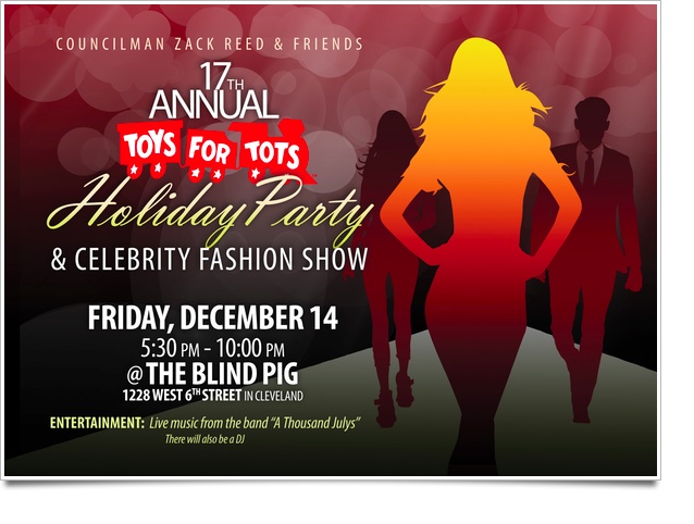 Councilman Zack Reed and Friends are putting on the 17th annual Toys for Tots Holiday Party & Celebrity Fashion Show. Bring a toy to donate and mingle w/ local celebrities @ the Blind Pig.