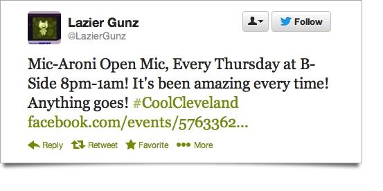 Congrats! Every Wednesday we ask you to tweet the event that you are most excited for with the hashtag #CoolCleveland. If we like your tweet the most, then you can win free publicity for your event! @LazierGunz won this week’s CoolCleveland Hashtag Contest with his tweet: