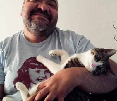 During that time, Camarillo, a cat lover, became friends with Debbie & Pete Gulyas of Blue Arrow Records and the Waterloo Alley Cat Project. He would stay at their house when he was in town and, Debbie recalls, “There’s this great big guy and he’s got our cats all over him.”