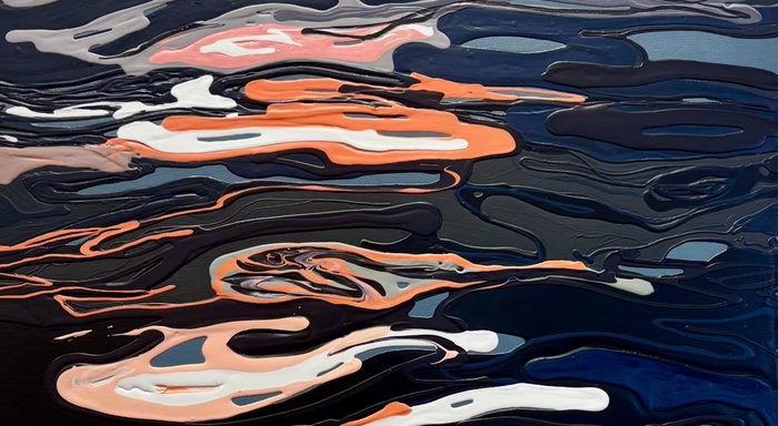 Light in Dark is a new series of paintings by Hilary Gent. She’s widely know as the owner of HEDGE Gallery at 78th Street Studios, but her evocative paintings of water display a range of color, form and movement that makes water seem almost human. Her artist statement for this show says that she drawing inspiration from her deep personal connection to Lake Erie, exploring the meditative and ever-shifting nature of water. It tells us that “Working with her canvases laid flat, she pours and layers paint in a fluid process that mirrors the surface movement of the lake itself.”