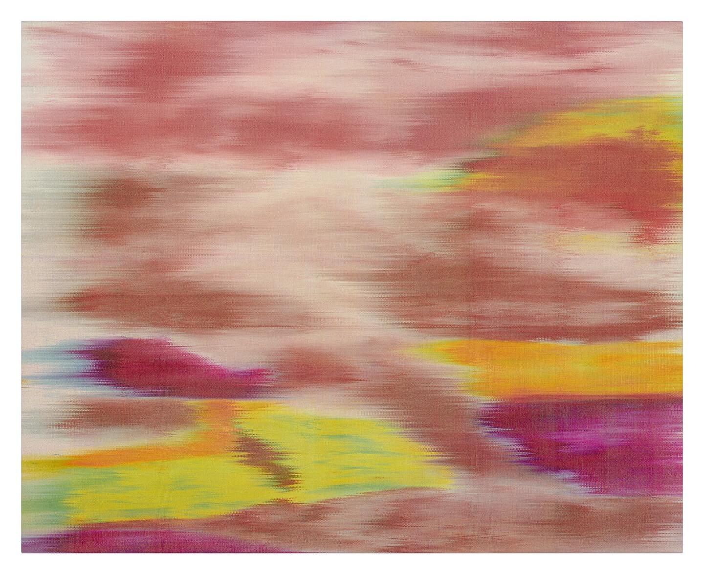 It’s Iceland’s distinctive landscape that inspires her evocative abstract textile pieces that are part painting and part weaving. She uses photos and watercolors as the basis for her images, painting on silk and weaving her hand-painted threads.
