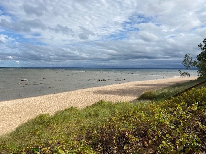 We drove straight through to Sleeping Bear Dunes National Seashore, a six-hour drive from our western Cuyahoga County starting point. Lake Michigan and the largest moving sand dunes in the world did not disappoint—the water is like the ocean, white sand is everywhere, and even though it was prime time for fall color, we saw few visitors. We drove the Pierce Stocking scenic loop trail that stops at beaches and points of interest, like Glen Lake with its deep blue water, a lake carved out, as most of the area was, by glaciers, with Alligator Hill in the midst of it. At the Dune Overlook and from the Cottonwood Trail, we viewed the dunes from above, then hiked sandy trails through dune grasses and scrub. Lake Michigan overlook, 450 feet above Lake Michigan, and North Bar Lake Overlook gave us awesome landscape views.