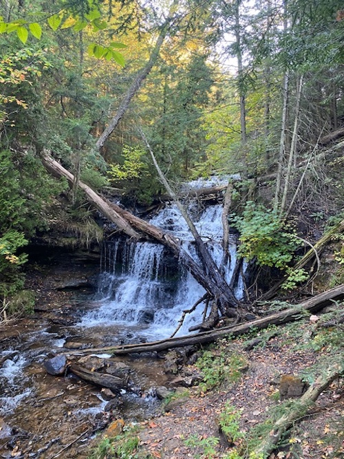 The area near Pictured Rocks is known for its waterfalls. We entered the National Seashore through Hiawatha National Forest on dirt and gravel roads to find Wagner’s Falls, which is a series of falls flowing over terraced rocks. From there, we walked on the wide beach and sandy promenades that took us out into the bay on sandbars scattered with driftwood and manmade teepees. Across the water, the historic lighthouse at Sand Point felt remote.