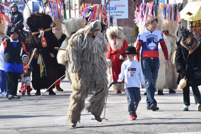 Once again, the Slovenian community invited all of Cleveland to celebrate Kurentovanje, a Slovenian festival that greets the incoming (hopefully) spring, as furry kurenti clang giant bells to chase away the winter. Luckily it was sunny and in the 40s, making it a pleasant day to watch the parade coming down St. Clair featuring local organizations, civic leaders and politicians, polka bands, dance ensembles, church groups, a high school band, and the kurenti bringing up the rear. Inside the Slovenian home, kids frolicked in the basement while the Garrett Tatiana polka band played; upstairs there was food, drink, ethnic dancers and rock band LoConti. Out back were food vendors and a tent stage with the Chardon Polka Band doing its rowdy upbeat thing.