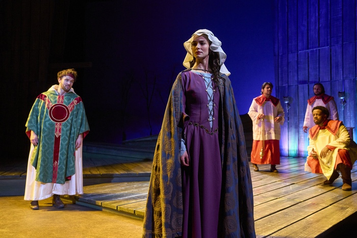 The Hanna Theatre stage design by Courtney O’Neill features sloping platform levels. As a result, locations shift instantly from woodland to castle via surrounding wooden walls which magically reveal scene-enhancing windows and doors.