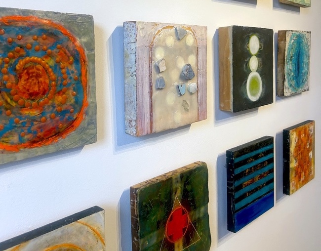 Susan Squires, whose work recently appeared in a show at Context Gallery, one floor up from HEDGE, has been working in encaustic for the last couple of decades, creating mixed-media geometric abstractions. “My work is influenced by dialogue between ancient ways of knowing and our modern world view,” she assets.